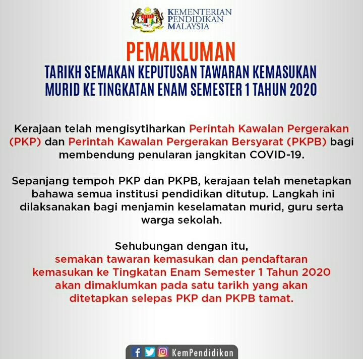 Keputusan peperiksaan sijil tinggi persekolahan malaysia (stpm) tahun 2020 akan diumumkan pada khamis, 1 julai 2021. Semakan keputusan murid tahun 1 2020/2021 online|bilakah tarikh semakan keputusan murid tahun 1 tahun 2020/2021? Bagi ibu bapa yang ingin mendaftar anak ke sekolah rendah kerajaan tahun 2019 dan 2020, permohonan pendaftaran murid ke tahun satu (darjah 1) di seluruh negeri di semenanjung malaysia ambilan 2019 dan 2020 akan dibuka secara online. Pendaftaran ke mrsm tingkatan 1 dan tingkatan 4 akan dibuat pada tarikh akan dikemaskini (tahun lepas pada 6 januari 2020). Tarikh semakan keputusan mrsm 2019 adalah pada hari jumaat, 21 disember 2018.